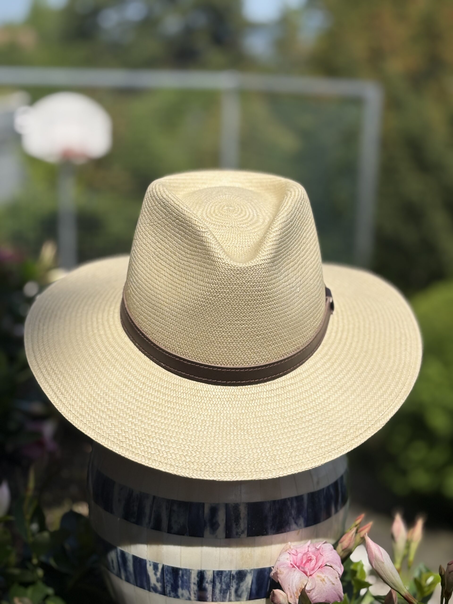 Hut aus Toquilla-Stroh, handgefertigt in Ecuador, Zopfmuster, Dschungelform, Stirnband aus braunem Leder.